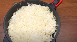 - Կաղամբը երկարավուն կտրատել, համեմել աղով: Տապակել բուսական յուղի մեջ 2–3 րոպե, այնուհետև փակել կափարիչով և ցածր կրակի վրա շոգեխաշել մոտ 30 րոպե: (կարելի է մի փոքր ջուր ավելացնել)