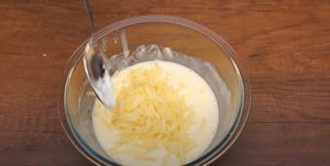 - Տարայի մեջ լցնել ձուն, թթվասերը և լավ հարել: Պանիրը քերիչով անցկացնել և ավելացնել թթվասերով զանգվածին, համեմել մի փոքր աղով: