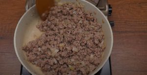 - Սոխը կտրատել, տապակել 1–2 րոպե, ավելացնել աղացած միսը, խառնել և տապակել միջին կրակի վրա, մինչև միսն իր գույնը փոխի: Այնուհետև համեմել աղով և պղպեղով, խառնել և հանել կրակի վրայից: