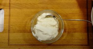 • Թթվասերը խառնել մայոնեզի հետ, վրան սխտոր ճզմել, ավելացնել սև պղպեղ և լավ խառնել։