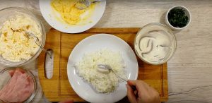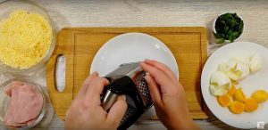 • Միջուկի համար ձուն եփել: Դեղնուցն ու ապիտակուցն առանձին–առանձին անցկացնել քերիչով: Պանիրը ևս քերիչով անցկացնել, իսկ մաղադանոսը մանր կտրատել: