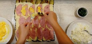 • Վրան հավասարաչափ քսել պանիրը, շարել խոզապուխտը։ Հերթականությամբ քսել դեղնուցն ու սպիտակուցը, լցնել մաղադանոսը։