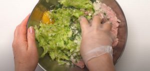 - Ավելացնել աղը և սև պղպեղը, սխտորը, սպիտակաձավարը, մանրացված կանաչին, ձուն, քամած քերած դդմիկը, և լավ ձեռքով խառնել: թողնել սառնարանում 30 րոպե: