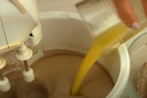 - Այս զանգվածի կեսը աստիճանաբար լցնել ձվով զանգվածի մեջ, ավելացնել մածուն, հալեցրած կարագ, հետո ալրային զանգվածի մյուս կեսը՝ զուգահեռաբար շարունակելով հարել խառնուրդը: