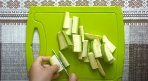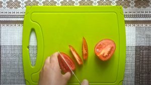 • Դդմիկները և լոլիկը երկարությամբ կտրատել: