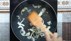 • Սոխը կտրատել կիսալուսնաձև: Տապակել բուսայուղով մինչև թափանցիկ դառնալը: