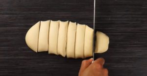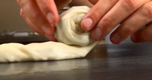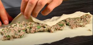 - Խմորը ուղանկյունաձև գրդնակել, վրան լցնել միջուկը (ծայրերը բաց թողնել), լայն ծայրերը ծալել: