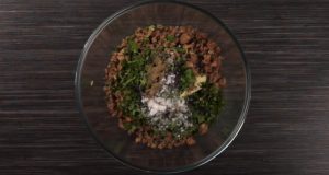 - Միջուկի համար աղացած միսը և կարտոֆիլի խյուսը խառնել, ավելացնել կտրատված մաղադանոսը և ռեհանը, համեմել աղով և պղպեղով: