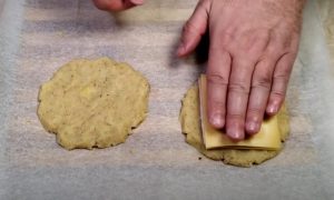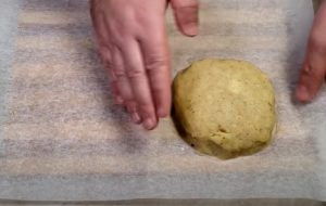 • Տախտակի վրա յուղաթերթ փռել, ձեռքերը ձեթոտել, և կարտոֆիլային զանգվածից որոշ մաս առանձնացնելով՝ 2 շրջան պատրաստել (5-7 մմ հաստությամբ):