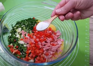 • Կանաչին, բուլղարական պղպեղը և երշիկը կտրատել, ավելացնել ձուն, աղը և խառնել:
