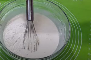 • Առանձին ամանի մեջ լցնել կաթը, ալյուրը, սոդան, աղը և խառնել: