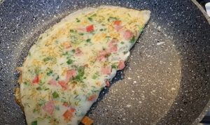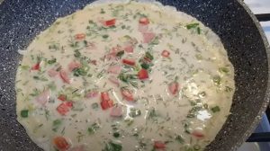 • Կաթով զանգվածը լցնել ձվով զանգվածի մեջ, համեմել սև և կարմիր պղպեղով ու խառնել: