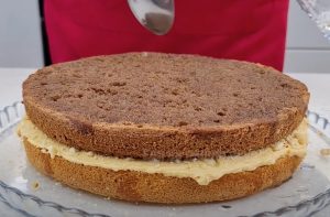 - Բիսկվիթները բաժանել երկու մասի, բիսկվիթի վերին անհարթ մասը կտրել, շերտերը թրջել շաքարաջրով: