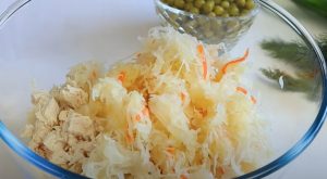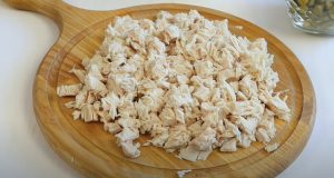 - Հավի կրծքամիսը խաշել և կտրատել: