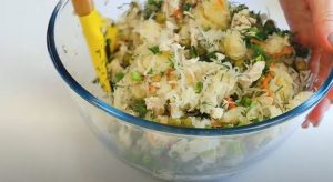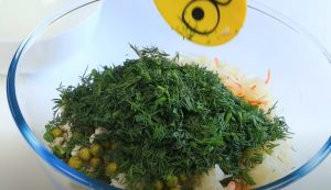 - Այս բաղադրիչները, ոլոռը միավորել, ավելացնել ձեթ, համամել աղով և պղպեղով և խառնել:
