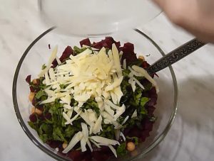- Պանիրը քերիչով անցկացնել, ավելացնել աղցանին: