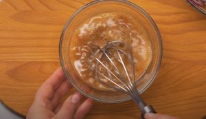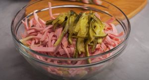 - Համեմունքներին ավելացնել քացախ, մարինացված վարունգի հյութ, ջուր, մանանեխ, բուսայուղ, լավ խառնել , և ավելացնել աղցանին: