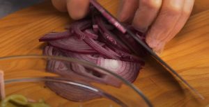 - Սոխը կիսալուսնաձև մանր կտրատել: