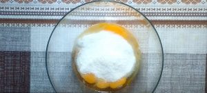 - Ձուն հարել, մինչև սպիտակ և ծավալուն զանգված ստացվի: