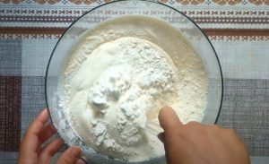 - Ալյուրին ավելացնել փխրեցուցիչը, և քիչ-քիչ ավելացնել: