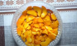 - Դեղձերը կտրատել, և շարել տարայի մեջ: