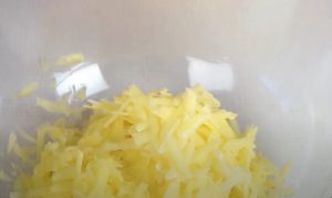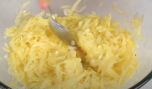 - Կարտոֆիլը քերիչով անցկացնել, սոխը մանր կտրատել: