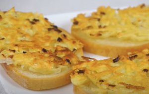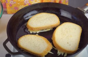 - Կարտոֆիլով զանգվածից լցնել հացի կտորների վրա, և այդ զանգվածը դեպի ներքև շրջելով՝ կտորները դնել ձեթով թավայի մեջ: