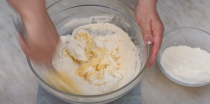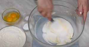 - Փխրեցուցիչը խառնել ալյուրին, քիչ–քիչ ավելացնել, լավ խառնել, կարևոր է, որ ալյուրը լավ խառնվի խմորին, թր թխելիս գույնը չփոխվի: