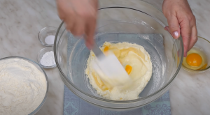 - Ավելացնել ձուն՝ հատ–հատ, խառնել,որ ստացվի միասեռ զանգված: