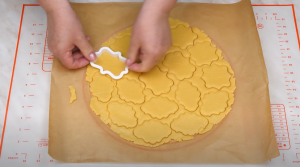 - Խմորը բաժանել 2 մասի, ծածկել սննդային թաղանթով, դնել սառնարանի մեջ 30 րոպե: