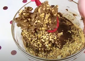 - Այնուհետև խառնուրդը վերցնել գազօջախի վրայից, մեջը կաթի փոշի և մանրեցված գետնանուշ ավելացնել և խառնել: