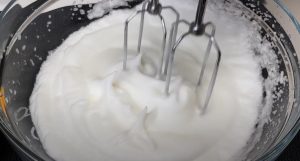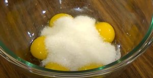 - Ձվի սպիտակուցն առանձնացնել դեղնուցից: Սպիտակուցը հարել, աստիճանաբար ավելացնել 75 գրամ շաքարավազ, հարել մինչև փրփրելը (ստացված զանգվածը պետք է կայուն լինի, ստուգելու համար կարելի է պտտել տարան, զանգվածը չպետք է ծորա):
