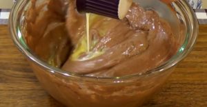 - Դեղնուցին ավելացնել 75 գրամ շաքարավազ և հարել 2–3 րոպե: Ալյուրը և կակաոն խառնել: