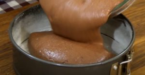 - Ջեռոցը տաքացնել մինչև 200°C ջերմաստիճանը: Ձևամանի մեջ կարագ քսել, վրան ալյուր շաղ տալ, այնուհետև լցնել խմորը: