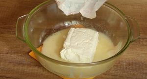 - Այնուհետև ավելացնել կաթնաշոռը և խառնել այնքան, մինչև միասեռ զանգված կստացվի: