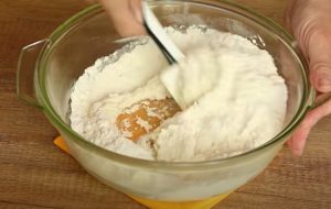 - Զանգվածի մեջ լցնել փխրեցուցիչ և 2 ճաշի գդալ ալյուր ու կրկին լավ խառնել: