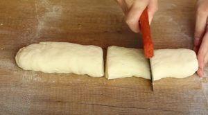 - Խմորին երկարավուն երշիկի տեսք տալ և բաժենել 12 մասի: