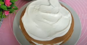 - Շերտերի վրա քսել կրեմը, և շերտերը դնել իրար վրա: Պատել ամբողջ տորթը կրեմով և ձևավորել փշրանքներով: