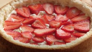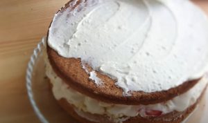• Տորթը ծածկել «կափարիչով», ամբողջությամբ ծածկել կրեմով և ձևավորել ելակով: