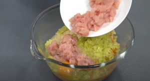 - Մնացած 300 գրամ հավի փափկամիսը մանր կտրատել և ավելացնել աղացած բաղադրիչներին: