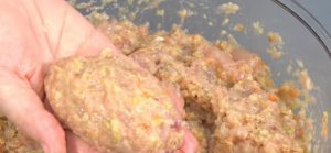 - Ավելացնել ձուն, աղն ու սև պղպեղը, ճզմել սխտորը, և ամբողջը լավ խառնել: (զանգվածը պետք է ստացվի ավելի ջրալի, քան այլ կոտլետների համար նախատեսված աղացած զանգվածը, բայց եթե չափից շատ ջրալի է, ապա կարելի է մի քանի կտոր չոր հաց անցկացնել քերիչով և ավելացնել խառնուրդին)