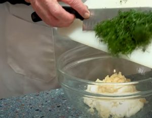 - Սոուսը պատրաստելու համար մայոնեզի մեջ ավելացնել ճզմված սխտոր, մանր կտրատված սամիթ և խառնել: