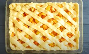 • Խմորի մնացած մասը գրտնակել, երկարավուն կտորների կտրատել, և դրանցով ցանցի պես ծածկել ծիրանի կտորները: