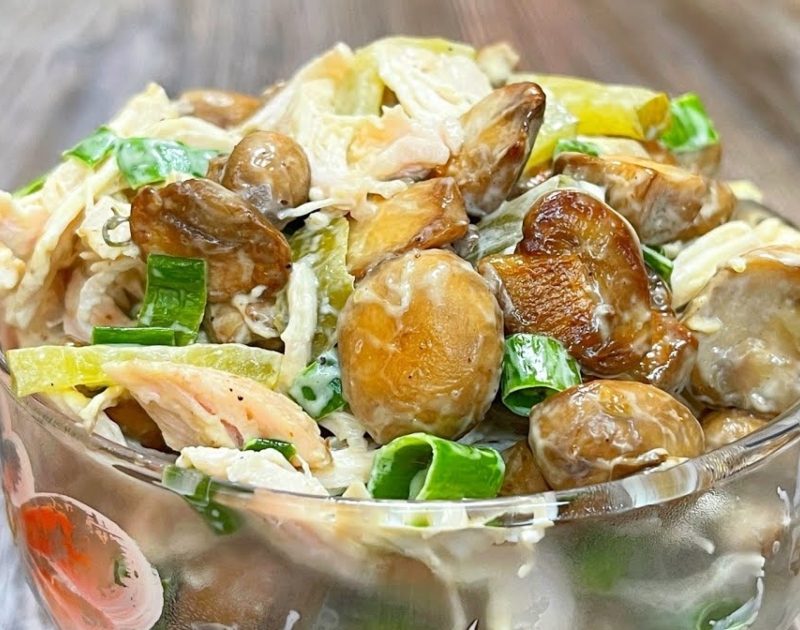 Բաղադրիչներ 400 գ սունկ 1 հավի խաշած կրծքամիս 1 մարինացված …