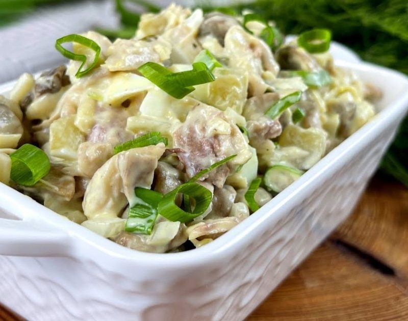 Բաղադրիչներ 300 գ հավի խաշած կրծքամիս 300 գ սունկ 1 …